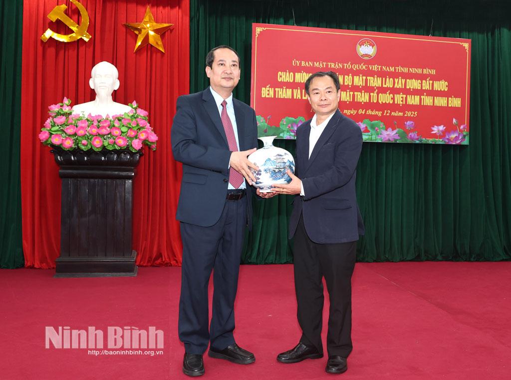 Đề cập đến mối quan hệ hữu nghị truyền thống, tình đoàn kết đặc biệt giữa hai quốc gia Việt Nam - Lào, mối quan hệ gắn bó mật thiết giữa tỉnh Ninh Bình với các địa phương của Lào, đồng chí Phó Chủ tịch Thường trực Ủy ban MTTQ Việt Nam tỉnh hy vọng Đoàn sẽ có buổi làm việc tại Ninh Bình hiệu quả, giúp các thành viên trong Đoàn có cái nhìn thực tiễn về các mô hình kinh tế cộng đồng, về đất nước, con người Việt Nam nói chung cũng như về miền đất cố đô Ninh Bình nói riêng, góp phần thắt chặt tình cảm gắn bó, đoàn kết giữa hai nước Việt Nam - Lào.