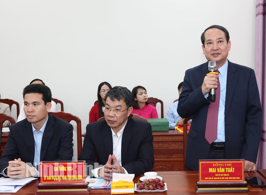 Phát biểu chào mừng, đồng chí Mai Văn Tuất, Phó Bí thư Tỉnh ủy, Chủ tịch Ủy ban MTTQ Việt Nam tỉnh bày tỏ vui mừng được đón Đoàn cán bộ Trung ương Mặt trận Lào xây dựng đất nước về thăm và làm việc tại tỉnh Ninh Bình nhân dịp sang Việt Nam tham gia lớp đào tạo, bồi dưỡng về vận động nông dân phát triển kinh tế và đã chọn Ninh Bình cho chuyến nghiên cứu thực tế. Chuyến thăm không chỉ thể hiện tình cảm hữu nghị truyền thống gắn bó giữa nhân dân hai nước Việt Nam - Lào, mà còn là dịp để Mặt trận hai nước trao đổi, chia sẻ kinh nghiệm trong công tác, tăng cường sự hiểu biết, đoàn kết và hợp tác. Đây cũng là cơ hội để Ninh Bình giới thiệu những kết quả nổi bật trong công tác Mặt trận, về các nhiệm vụ phát triển kinh tế - xã hội, cũng như các mô hình hay, cách làm sáng tạo của Hội Nông dân tỉnh. Đặc biệt là chính quyền địa phương hai cấp và mô hình các đoàn thể chính trị-xã hội trực thuộc Ủy ban MTTQ là những mô hình mới để Đoàn cán bộ Trung ương Mặt trận Lào xây dựng đất nước nghiên cứu, học tập. Đồng chí chúc Đoàn có chuyến thăm và làm việc tại Ninh Bình đạt hiệu quả, có nhiều ấn tượng tốt đẹp.
