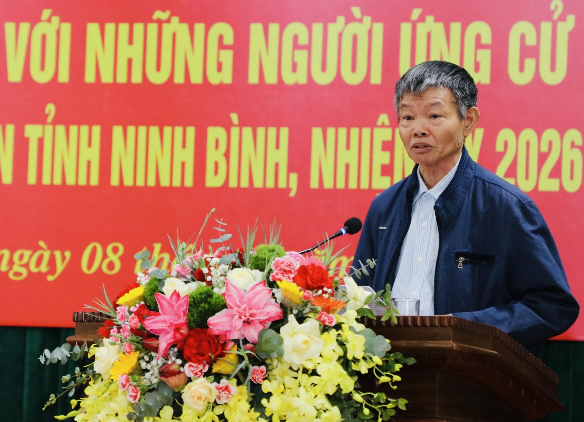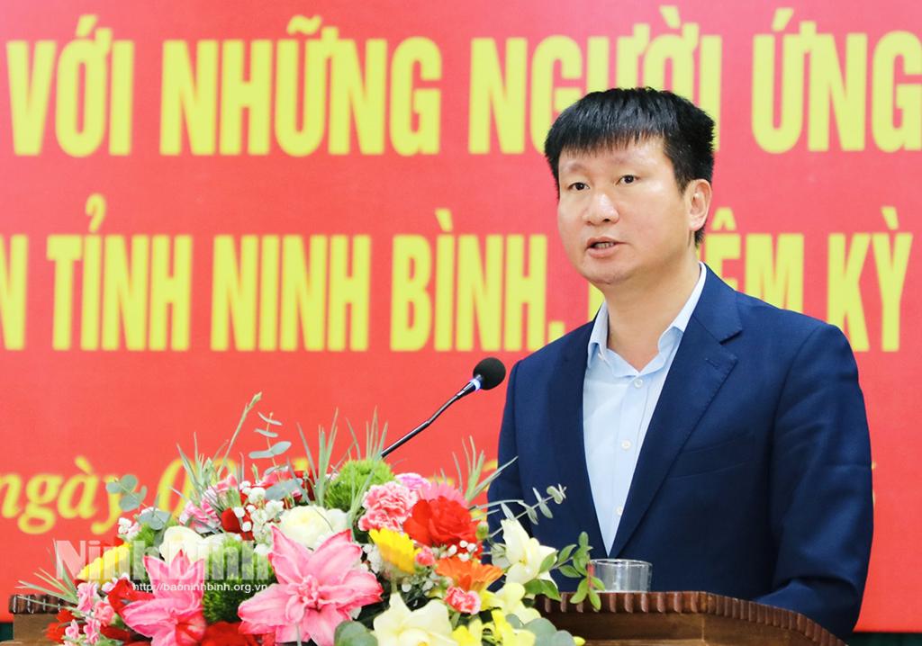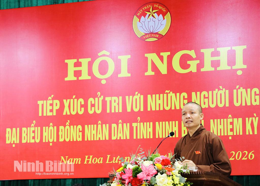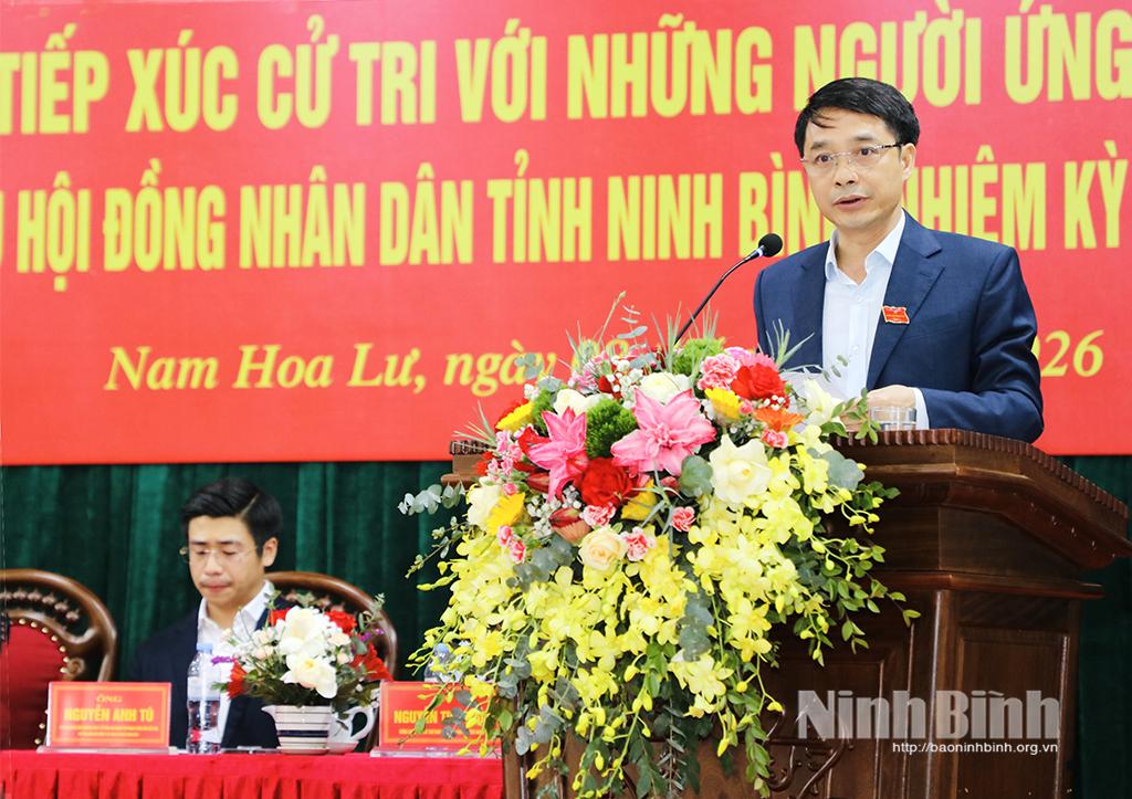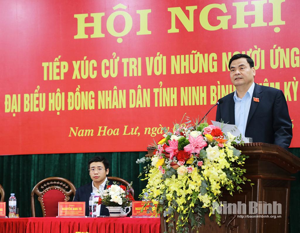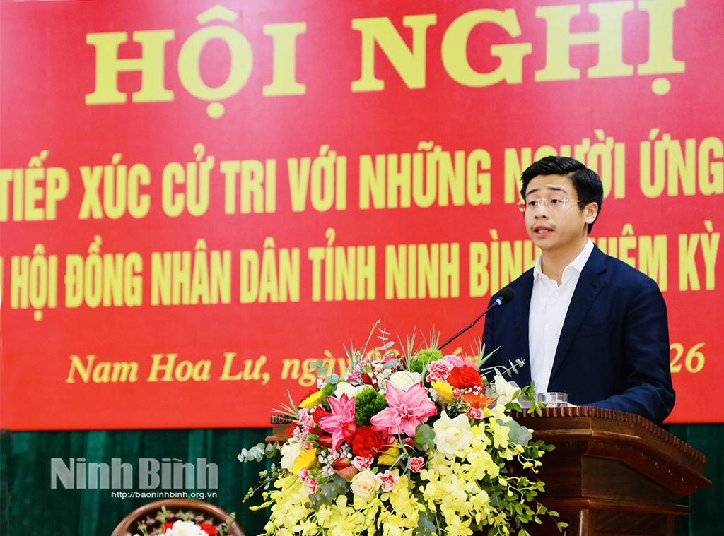Tại hội nghị, đại diện Ủy ban MTTQ Việt Nam phường Nam Hoa Lư giới thiệu tiểu sử tóm tắt các ứng cử viên đại biểu HĐND tỉnh khóa XVI thuộc Đơn vị bầu cử số 8, gồm các ông, bà: Trần Huy Tuấn, Uỷ viên Trung ương Đảng, Bí thư Tỉnh uỷ; Hoàng Văn Kiên, Tỉnh uỷ viên, Phó Chủ tịch HĐND tỉnh; Bùi Thành Đông, Tỉnh uỷ viên, Bí thư Đảng uỷ phường Hoa Lư; Nguyễn Minh Chiên (Thượng toạ Thích Minh Quang), Phó Trưởng Ban Thường trực Ban Trị sự Giáo hội Phật giáo Việt Nam tỉnh; Nguyễn Anh Tú, Phó Chủ tịch HĐQT, Phó Tổng giám đốc Công ty Cổ phần Tập đoàn Thành Công; Nguyễn Thu Thuỷ, Công chức, Phó Bí thư Đoàn phường Hoa Lư; Đinh Thị Tuyết, Kế toán trưởng Công ty cổ phần Châu Giang; Lê Thị Yến, Công chức Văn phòng Ban Tuyên giáo và Dân vận Tỉnh uỷ.