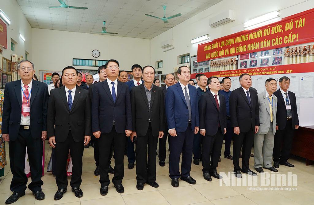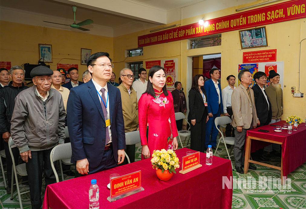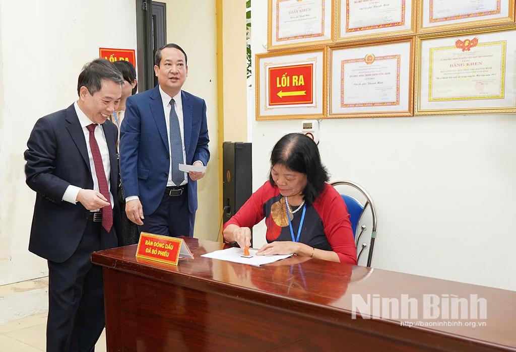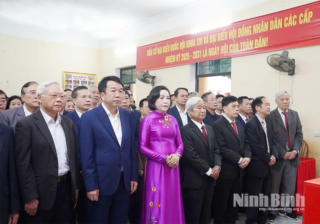 * Đồng chí Mai Văn Tuất, Phó Bí thư Tỉnh ủy, Chủ tịch Ủy ban MTTQ Việt Nam tỉnh, Phó Trưởng Ban Chỉ đạo cuộc bầu cử tỉnh; đồng chí Nguyễn Tiến Thành, nguyên Phó Bí thư Thường trực Tỉnh ủy, nguyên Chủ tịch HĐND tỉnh Ninh Bình (cũ) và các đại biểu dự lễ khai mạc và bỏ phiếu tại Khu vực bỏ phiếu số 32, phường Hoa Lư.