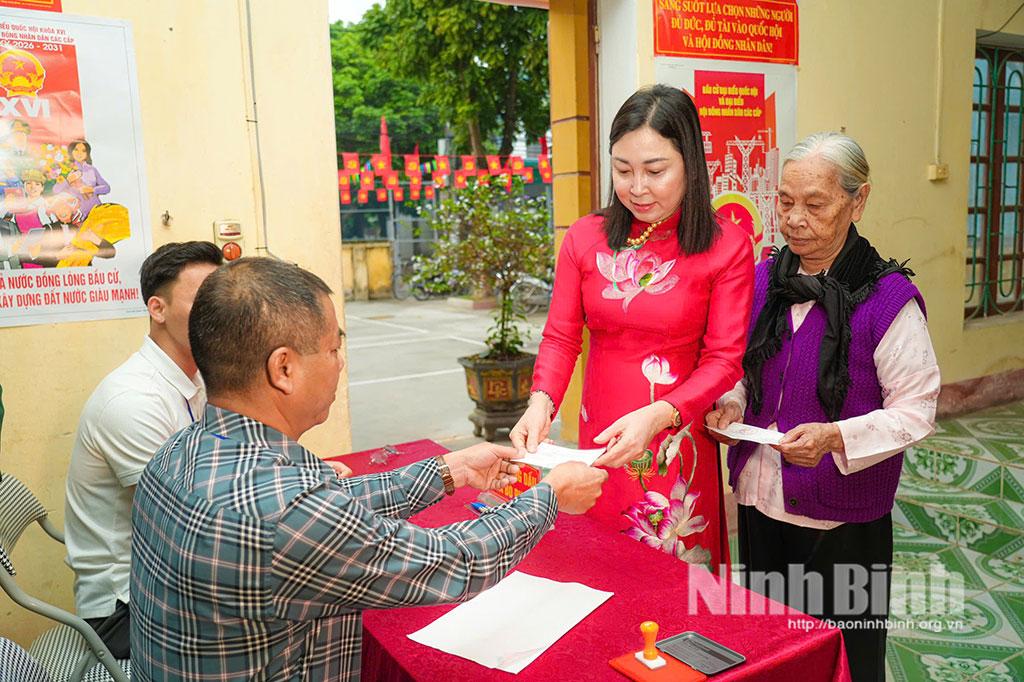 Đồng chí Nguyễn Thị Thanh, Ủy viên Trung ương Đảng, Phó Chủ tịch Quốc hội thực hiện bỏ lá phiếu đầu tiên tại Khu vực bỏ phiếu số 27, phường Hoa Lư. Ảnh: Trần Giang