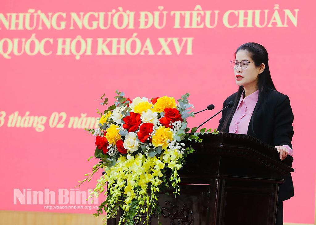 Để danh sách chính thức những người đủ tiêu chuẩn ứng cử đại biểu Quốc hội khoá XVI đảm bảo số lượng, trình độ, uy tín cơ cấu nữ, trẻ tuổi, người ngoài Đảng và đại diện các thành phần xã hội theo quy định của Luật, đồng chí đề nghị các đại biểu dự hội nghị tập trung thảo luận, đánh giá kỹ lưỡng, toàn diện về phẩm chất đạo đức, lối sống và mối quan hệ giữa người ứng cử với Nhân dân tại địa phương. Đồng thời, thảo luận cho ý kiến về một số ứng cử viên tỷ lệ tín nhiệm của cử tri nơi cư trú thấp và một số ứng cử viên có đơn xin rút không tham gia danh sách ứng cử; biểu quyết thông qua danh sách chính thức những người đủ tiêu chuẩn ứng cử đại biểu Quốc hội khoá XVI đang cư trú và đang công tác trên địa bàn tỉnh Ninh Bình.
