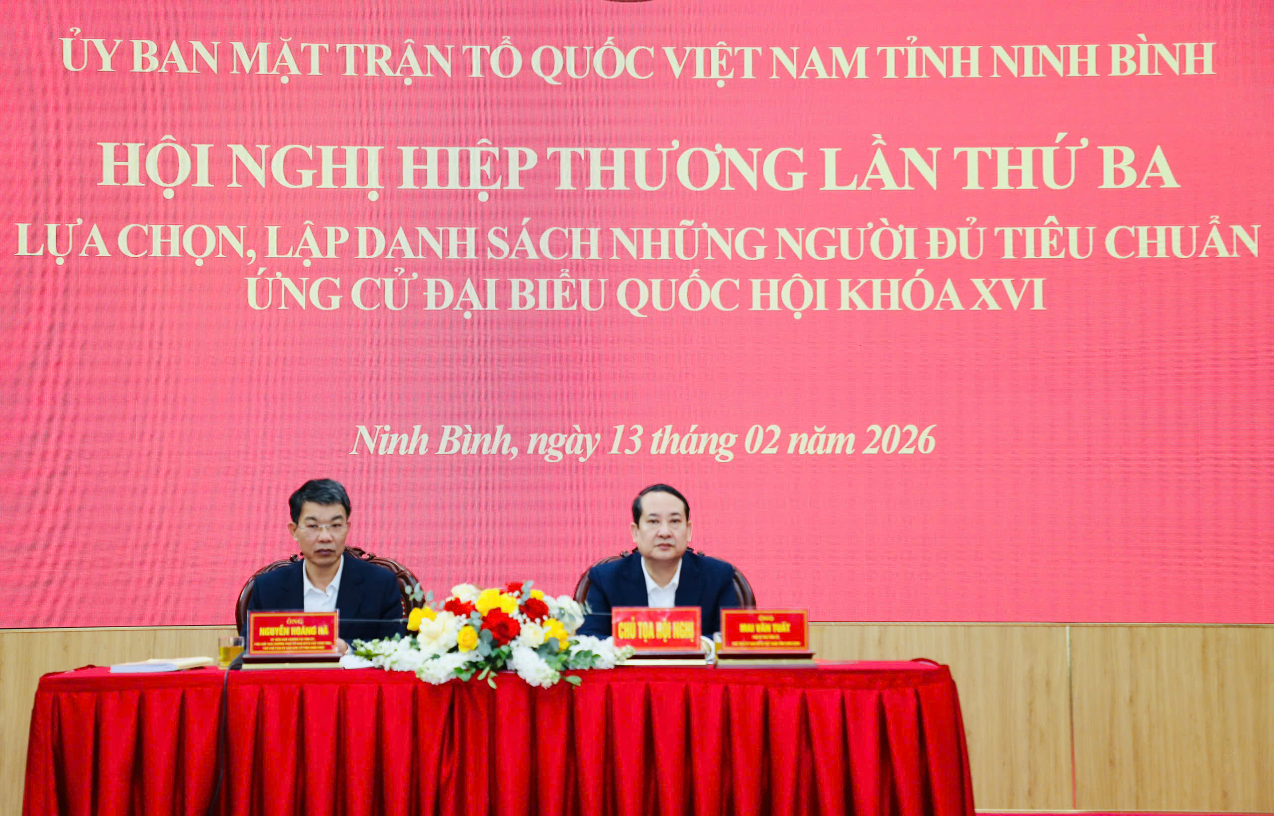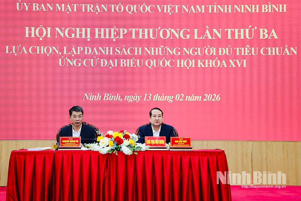 Sáng 13/2, Ban Thường trực Ủy ban MTTQ Việt Nam tỉnh tổ chức hội nghị hiệp thương lần thứ ba để lựa chọn, lập danh sách những người đủ tiêu chuẩn ứng cử đại biểu Quốc hội (ĐBQH) khóa XVI, nhiệm kỳ 2026-2031. Đồng chí Mai Văn Tuất, Phó Bí thư Tỉnh ủy, Chủ tịch Ủy ban MTTQ Việt Nam tỉnh, Phó Trưởng Ban Chỉ đạo Cuộc bầu cử đại biểu Quốc hội khóa XVI và đại biểu HĐND các cấp tỉnh Ninh Bình, nhiệm kỳ 2026-2031 dự và chỉ đạo hội nghị.
