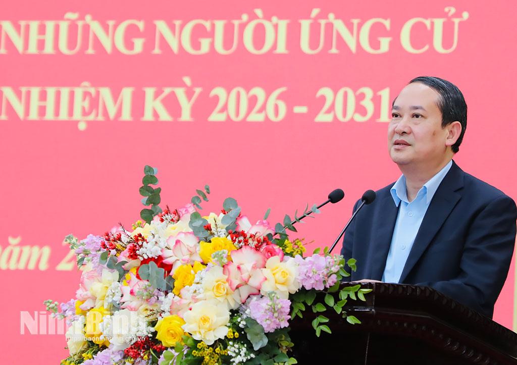 Đồng chí Mai Văn Tuất, Phó Bí thư Tỉnh ủy, Chủ tịch Ủy ban MTTQ Việt Nam tỉnh, Phó Trưởng Ban Chỉ đạo Cuộc bầu cử đại biểu Quốc hội khóa XVI và đại biểu HĐND các cấp tỉnh Ninh Bình, nhiệm kỳ 2026-2031 phát biểu tại hội nghị.