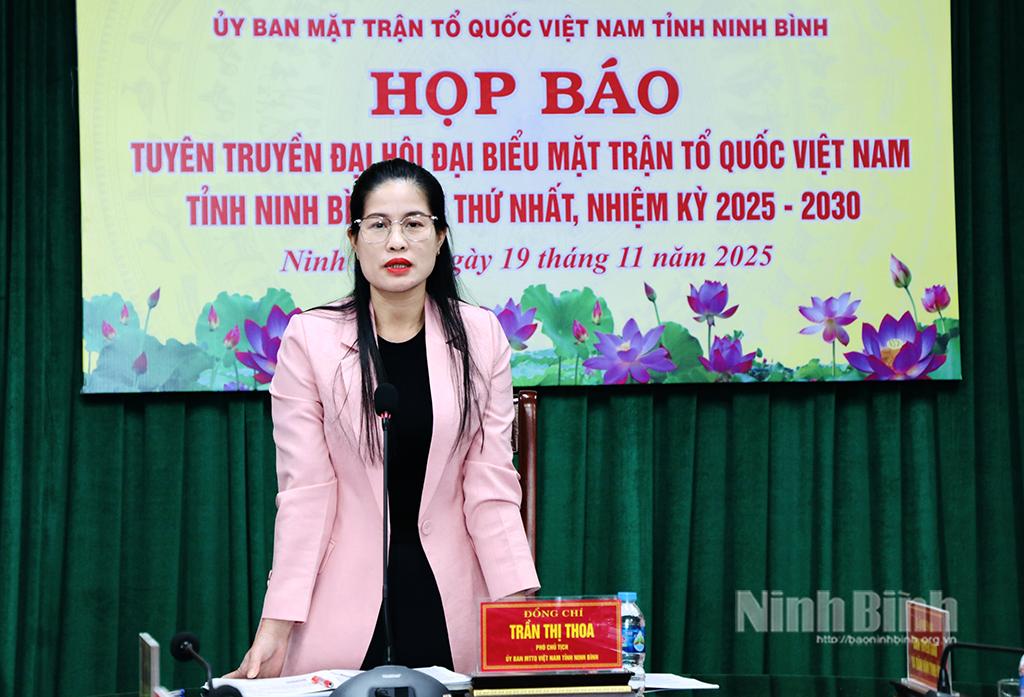 Chiều 19/11, Ban Thường trực Ủy ban MTTQ Việt Nam tỉnh tổ chức Họp báo tuyên truyền Đại hội đại biểu MTTQ Việt Nam tỉnh Ninh Bình lần thứ I, nhiệm kỳ 2025-2030. Dự buổi họp báo có lãnh đạo một số sở, ban, ngành liên quan; lãnh đạo, phóng viên các cơ quan thông tấn báo chí Trung ương và địa phương.