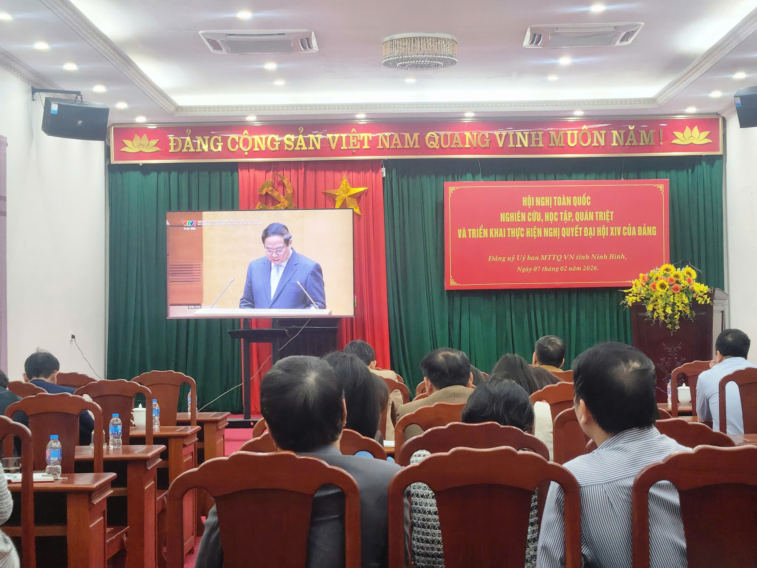 Ngày 07/02/2026, Đảng ủy Uỷ ban MTTQ Việt Nam tỉnh Ninh Bình tổ chức cho cán bộ, công chức, viên chức, người lao động theo dõi và học tập trực tuyến triển khai thực hiện Nghị quyết Đại hội XIV của Đảng tại các điểm cầu chi bộ trực thuộc.