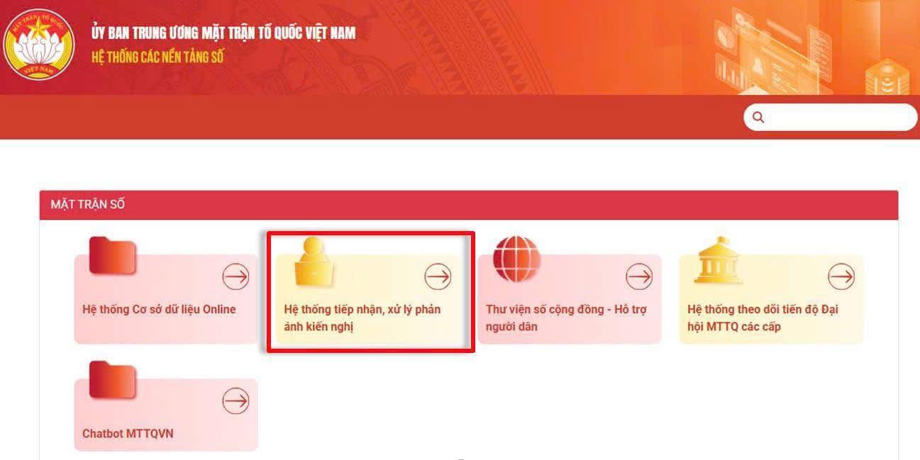 Truy cập vào nền tảng "Mặt trận số" tại địa chỉ http://app.mattranso.vn và lựa chọn biểu tượng phần mềm "Hệ thống tiếp nhận, xử lý phản ánh, kiến nghị của người dân" hoặc truy cập thẳng vào địa chỉ http://pakn.mattranso.vn để phản ánh ý kiến.