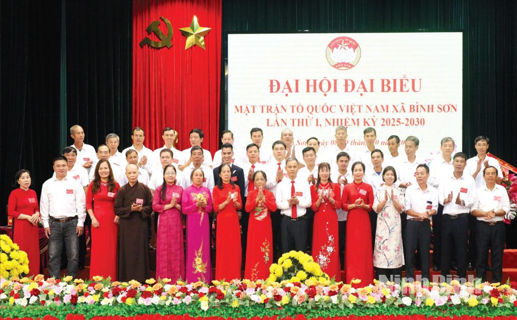 Đến hết tháng 10/2025, tỉnh Ninh Bình đã hoàn thành đại hội MTTQ xã, phường nhiệm kỳ 2025-2030, đảm bảo đúng tiến độ, quy định và hướng dẫn, chỉ đạo của Trung ương, Tỉnh ủy và Kế hoạch của Ban Thường trực Ủy ban MTTQ Việt Nam tỉnh. Trong ảnh: Các thành viên Ủy ban MTTQ Việt Nam xã Bình Sơn lần thứ I, nhiệm kỳ 2025-2030 ra mắt Đại hội. Ảnh: Lê Dũng