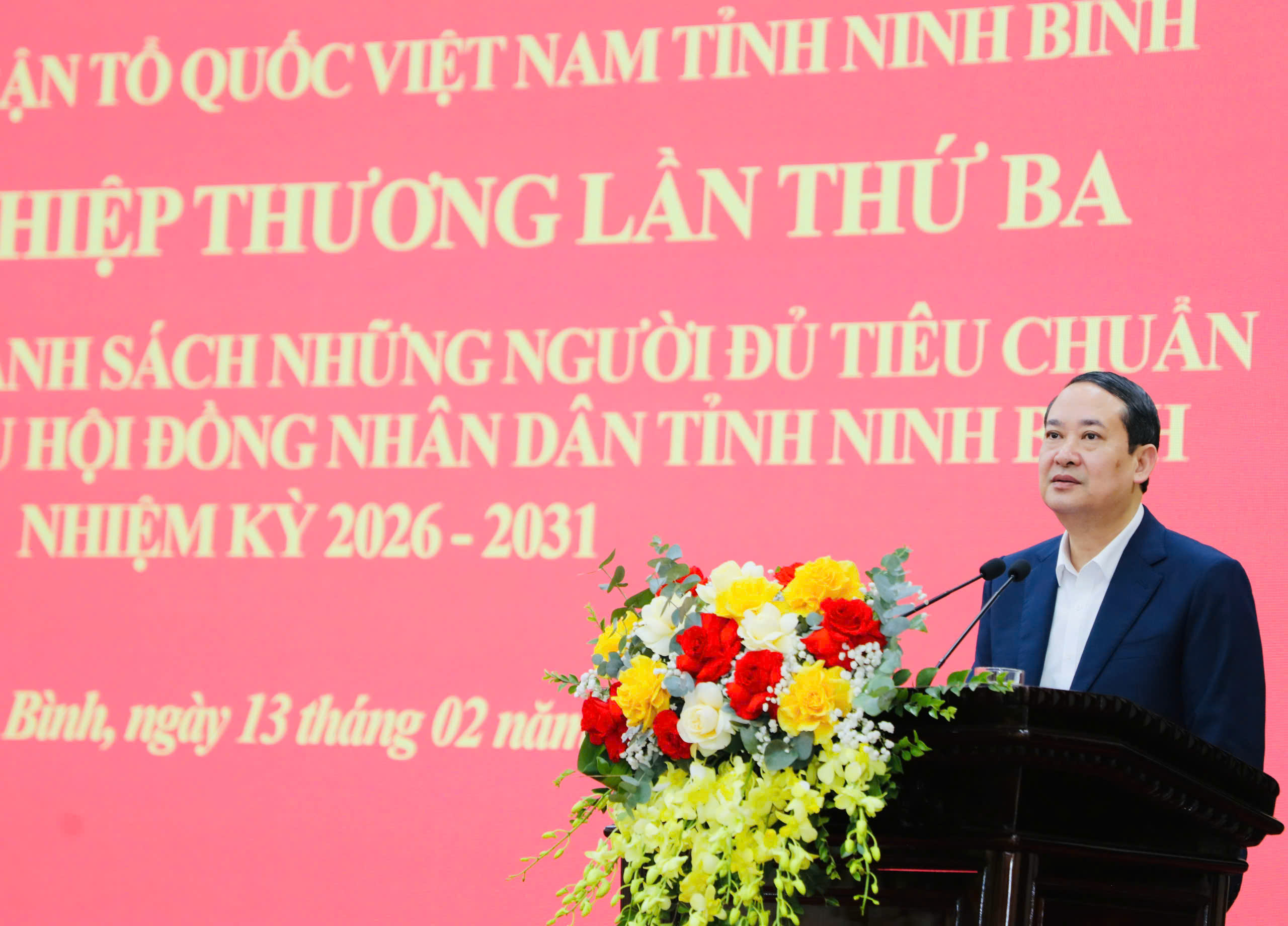Phát biểu tại hội nghị, đồng chí Mai Văn Tuất, Phó Bí thư Tỉnh ủy, Chủ tịch Ủy ban MTTQ Việt Nam tỉnh, Phó Trưởng Ban Chỉ đạo Cuộc bầu cử đại biểu Quốc hội khóa XVI và đại biểu HĐND các cấp tỉnh Ninh Bình, nhiệm kỳ 2026-2031 nhấn mạnh mục đích, ý nghĩa của Hội nghị hiệp thương lần thứ ba. Đồng chí lưu ý: Để đảm bảo danh sách chính thức những người ứng cử đại biểu HĐND tỉnh, nhiệm kỳ 2026-2031 đáp ứng yêu cầu về số lượng, chất lượng, trình độ, tiêu chuẩn và cơ cấu hợp lý theo quy định của Luật (trong đó chú trọng tỷ lệ nữ, người trẻ tuổi, người ngoài Đảng, đại diện doanh nghiệp, doanh nhân, tôn giáo, dân tộc, Ban Thường trực Ủy ban MTTQ Việt Nam tỉnh), đề nghị các đại biểu tập trung thảo luận, đánh giá kỹ lưỡng, toàn diện về phẩm chất đạo đức, lối sống, mối quan hệ giữa người ứng cử với Nhân dân tại địa phương; thảo luận, cho ý kiến đối với một số trường hợp người ứng cử có đơn xin rút khỏi danh sách vì lý do cá nhân. Đồng thời, thống nhất biểu quyết thông qua danh sách chính thức những người đủ tiêu chuẩn ứng cử đại biểu HĐND tỉnh Ninh Bình, nhiệm kỳ 2026-2031. Trên cơ sở đó, Ban Thường trực Ủy ban MTTQ Việt Nam tỉnh kịp thời bàn giao danh sách cho Ủy ban Bầu cử tỉnh theo đúng quy định, bảo đảm tiến độ và quy trình của cuộc bầu cử.