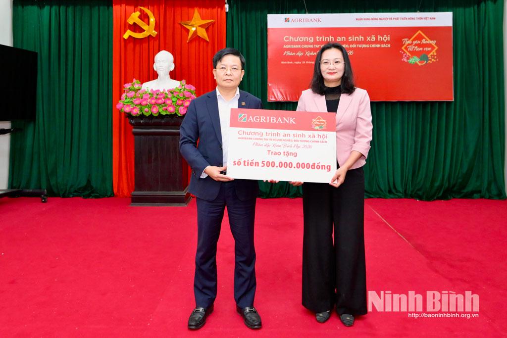 Nhân dịp Xuân Bính Ngọ năm 2026, Agribank Ninh Bình và Agribank Nam Ninh Bình thực hiện chương trình an sinh xã hội, chung tay vì người nghèo, đối tượng chính sách, thể hiện tinh thần chia sẻ, trách nhiệm xã hội và truyền thống nhân ái của Agribank đối với cộng đồng với thông điệp: “Agribank: Trao yêu thương - Tết trọn vẹn”. Qua đó, góp phần giúp đỡ, sẻ chia khó khăn để mọi người, mọi nhà đón Tết đầm ấm, đầy đủ hơn; đồng thời tiếp tục khẳng định vai trò, trách nhiệm, uy tín của Agribank - Ngân hàng thương mại Nhà nước chủ lực, luôn gắn hoạt động kinh doanh với trách nhiệm xã hội, góp phần thực hiện hiệu quả mục tiêu phát triển kinh tế - xã hội bền vững của quê hương, đất nước.