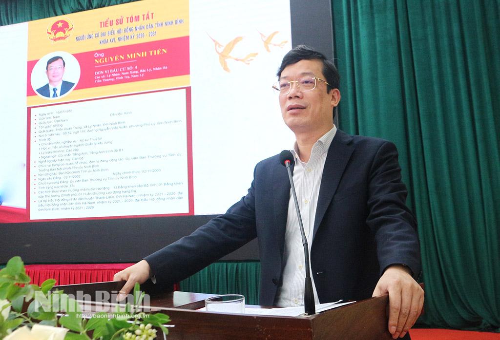 Các ứng cử viên đại biểu HĐND tỉnh Ninh Bình, nhiệm kỳ 2026- 2031 tại Đơn vị bầu cử số 4 gồm các ông, bà: Nguyễn Minh Tiến, Uỷ viên Ban Thường vụ Tỉnh uỷ, Trưởng Ban Nội chính Tỉnh uỷ; Lê Xuân Huy, Tỉnh uỷ viên, Phó Chủ tịch HĐND tỉnh; Phạm Anh Tuấn, Tỉnh uỷ viên, Trưởng Ban Văn hoá - Xã hội, HĐND tỉnh; Lê Thị Hồng Hà, Bí thư Đảng uỷ, Chủ tịch HĐND xã Vĩnh Trụ; Trần Thị Anh, Phó Trưởng Phòng Theo dõi công tác xử lý đơn, thư, tiếp công dân, Ban Nội chính Tỉnh uỷ; Nguyễn Thị Trung Anh, công chức Phòng Xây dựng công trình, Sở Nông nghiệp và Môi trường; Trần Ngọc Huyền, công chức Uỷ ban MTTQ Việt Nam xã Vĩnh Trụ.