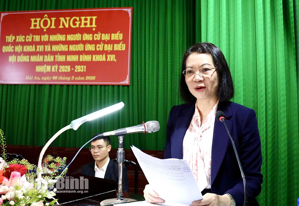 Thay mặt các ứng cử viên, đồng chí Mai Thị Phương Hoa, Uỷ viên Ban Chấp hành Đảng bộ Quốc hội, Phó Chủ nhiệm Ủy ban Pháp luật và Tư pháp của Quốc hội phát biểu cảm ơn sự quan tâm và ý kiến trách nhiệm của cử tri xã Hải An. Đồng chí cho biết các ứng cử viên sẽ tiếp tục hoàn thiện Chương trình hành động; giữ mối liên hệ chặt chẽ với cử tri, thường xuyên tiếp xúc để lắng nghe, tổng hợp đầy đủ tâm tư, nguyện vọng của nhân dân để phản ánh trung thực tới Quốc hội, HĐND tỉnh và các cơ quan có thẩm quyền. Đồng thời mong muốn tiếp tục nhận được sự quan tâm, tin tưởng và ủng hộ của cử tri trong thời gian tới.
