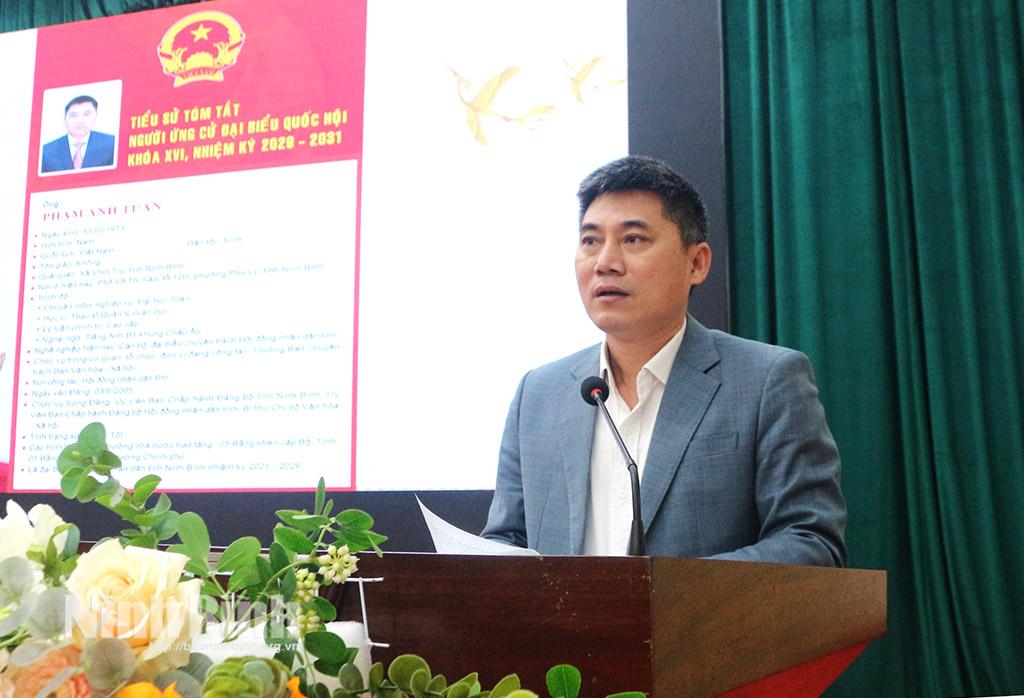 Những người ứng cử ĐBQH khóa XVI tại Đơn vị bầu cử số 2 gồm các ông, bà: Phạm Hùng Thắng, Tỉnh ủy viên, Phó trưởng Đoàn chuyên trách Đoàn ĐBQH tỉnh; Phạm Anh Tuấn, Tỉnh ủy viên, Trưởng Ban Văn hóa - Xã hội HĐND tỉnh; Vũ Thị Thu Huyền, công chức Ban Tổ chức kiểm tra, Ủy ban MTTQ Việt Nam tỉnh Ninh Bình; Phạm Thị Như Hoa, giáo viên Trường THPT chuyên Lê Hồng Phong, Sở Giáo dục và Đào tạo.